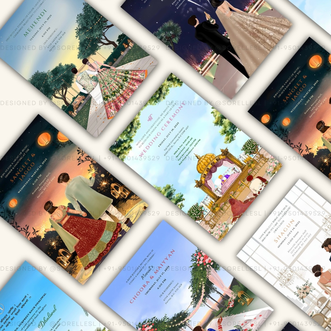 Add a touch of fun and personality to your wedding invites with our Caricature Invitation Suite. Featuring charming caricatures of the bride and groom in their pre-designed event outfits, this suite offers a playful yet elegant way to announce your celebrations. Each event card-whether Mehendi, Cocktail, Wedding, or Reception-captures the couple in beautifully illustrated looks, making your invitation set truly unique.