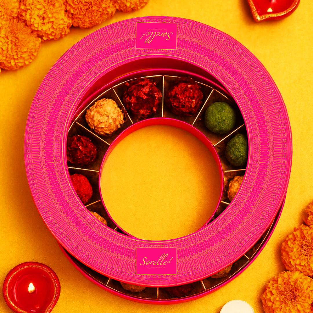 A statement of luxury and festivity, this exquisite circular box features a full foiling front and 18 individual cavities designed to hold each delicacy perfectly. The box includes a Diwali gift card and comes sealed with elegant ribbon detailing, making it a ready-to-gift piece of art.