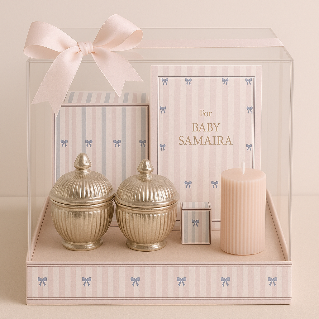 Charming, elegant, and full of playful sophistication, The Peekaboo Palace is a tender ode to early childhood and timeless grace. Adorned in delicate pastel hues with soft bow motifs, this beautifully styled box features elegant silver jars, a ribbed candle, and keepsake accents - thoughtfully curated to celebrate life’s sweetest beginnings. Designed to be both classic and heartwarming, it makes a perfect gift for welcoming a little one. To place an order, inquire about pricing, or learn more about The Peekaboo Palace, please reach out to us via DM on @SorelleSL or contact us at +91 95014 39529 - prices are available upon request.